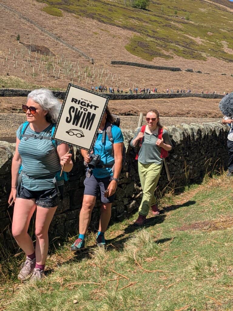 On Sunday, the now traditional walks and swim took place, greatly enhanced by the involvement of the national Right to Roam, who had organised public transport to bring in large numbers of supporters. After gathering for a rousing rally on the village hall green, campaigners marched out along the ‘trespass trail’ to William Clough and Kinder Reservoir, where there was yet again an inspiring swim event.